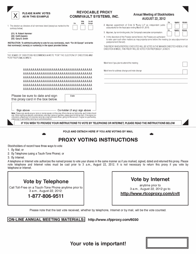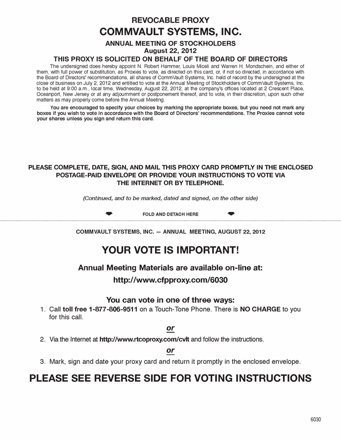 YOUR VOTE IS IMPORTANT! Annual Meeting Materials are available on-line at: http://www.cfpproxy.com/6030 You can vote in one of three ways: 1. Call toll free 1-877-806-9511 on a Touch-Tone Phone. There is NO CHARGE to you for this call. or 2. Via the Internet at http://www.rtcoproxy.com/cvlt and follow the instructions. or 3. Mark, sign and date your proxy card and return it promptly in the enclosed envelope. PLEASE SEE REVERSE SIDE FOR VOTING INSTRUCTIONS REVOCABLE PROXY COMMVAULT SYSTEMS, INC. ANNUAL MEETING OF STOCKHOLDERS August 22, 2012 THIS PROXY IS SOLICITED ON BEHALF OF THE BOARD OF DIRECTORS The undersigned does hereby appoint N. Robert Hammer, Louis Miceli and Warren H. Mondschein, and either of them, with full power of substitution, as Proxies to vote, as directed on this card, or, if not so directed, in accordance with the Board of Directors recommendations, all shares of CommVault Systems, Inc. held of record by the undersigned at the close of business on July 2, 2012 and entitled to vote at the Annual Meeting of Stockholders of CommVault Systems, Inc. to be held at 9:00 a.m., local time, Wednesday, August 22, 2012, at the companys offices located at 2 Crescent Place, Oceanport, New Jersey or at any adjournment or postponement thereof, and to vote, in their discretion, upon such other matters as may properly come before the Annual Meeting. You are encouraged to specify your choices by marking the appropriate boxes, but you need not mark any boxes if you wish to vote in accordance with the Board of Directors recommendations. The Proxies cannot vote your shares unless you sign and return this card. PLEASE COMPLETE, DATE, SIGN, AND MAIL THIS PROXY CARD PROMPTLY IN THE ENCLOSED POSTAGE-PAID ENVELOPE OR PROVIDE YOUR INSTRUCTIONS TO VOTE VIA THE INTERNET OR BY TELEPHONE. (Continued, and to be marked, dated and signed, on the other side) FOLD AND DETACH HERE COMMVAULT SYSTEMS, INC. ANNUAL MEETING, AUGUST 22, 2012 |