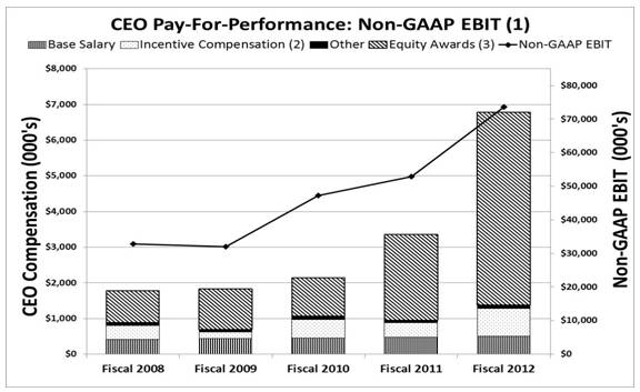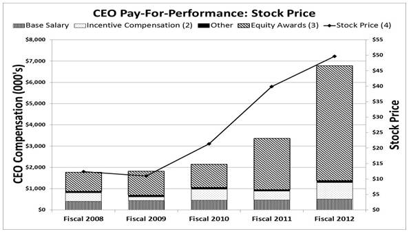 As described in detail under the heading Executive CompensationCompensation Discussion and Analysis, we strive to enhance long-term stockholder value by closely aligning our executive compensation philosophy and practices with the interests of our stockholders by rewarding achievement of specific annual, long-term, and strategic goals by our company, focusing on revenue growth and profitability. Our executive compensation program is designed to attract, motivate, and retain talented executives who possess the skills required to formulate and drive our companys strategic direction and achieve annual and long-term performance goals necessary to create stockholder value. Our compensation practices, which balance long-term and short-term awards, are structured to pay for performance, to encourage business decision-making aligned with the long-term interests of our company and to promote and to support the human resource requirements of our business. Please read the Compensation Discussion and Analysis discussion for additional details about our executive compensation programs, including information about the fiscal year 2012 compensation of our named executive officers.