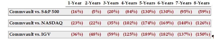 Stock-Price Performance: Commvault’s strategy, operations, execution and leadership over the past eight years have failed to generate returns to shareholders, despite a leadership position in a growing market with a product set that customers like and competitors respect. Commvault’s underperformance has been so profound that an investor would have been better off buying the NASDAQ index instead of Commvault’s stock on 99% of trading days in the last eight years[1]. The numbers speak for themselves:
