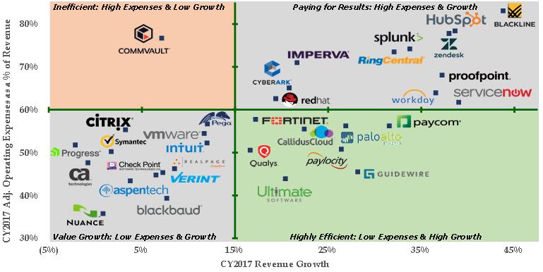 As the chart clearly shows, Commvault’s level of inefficiency is an extreme outlier in the industry. For example, almost none of the companies in this group spend more than 75% of revenue on operating expenses, including companies that are growing more than 25% per year such as Palo Alto Networks, ServiceNow and