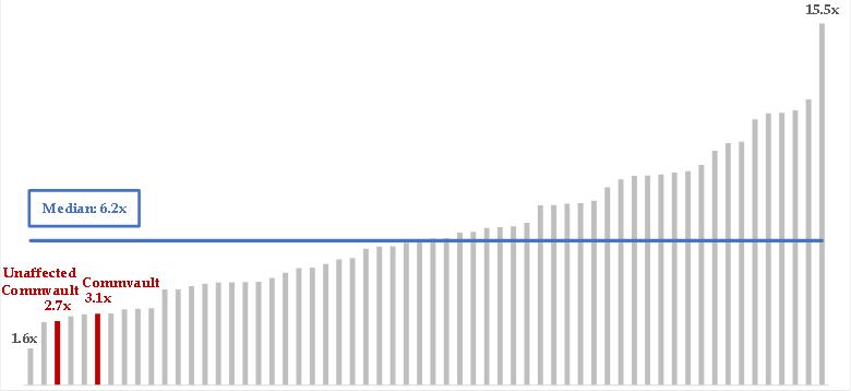 [5] Source: S&P Capital IQ and company filings. Group composed of the constituents of the S&P North American Technology Software Index. Excludes DVMT because it is a tracking stock of VMW. Commvault Unaffected multiple calculated using the unaffected price of February 20, 2018.