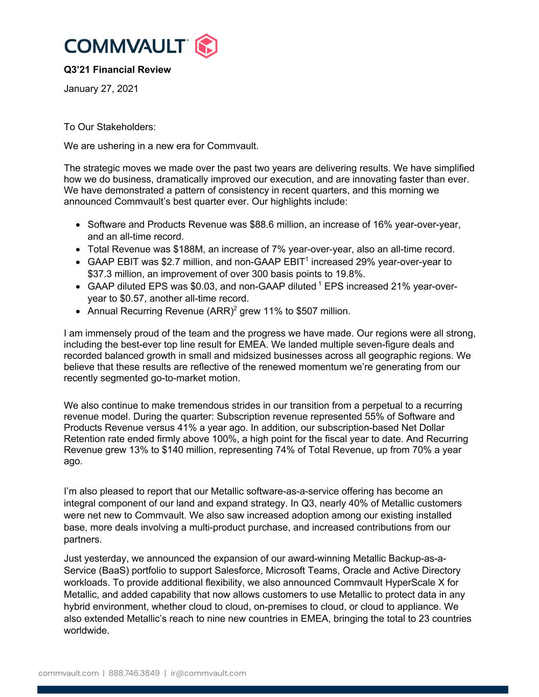 Q3’21 Financial Review January 27, 2021 To Our Stakeholders: We are ushering in a new era for Commvault. The strategic moves we made over the past two years are delivering results. We have simplified how we do business, dramatically improved our execution, and are innovating faster than ever. We have demonstrated a pattern of consistency in recent quarters, and this morning we announced Commvault’s best quarter ever. Our highlights include: • Software and Products Revenue was $88.6 million, an increase of 16% year-over-year, and an all-time record. • Total Revenue was $188M, an increase of 7% year-over-year, also an all-time record. • GAAP EBIT was $2.7 million, and non-GAAP EBIT1 increased 29% year-over-year to $37.3 million, an improvement of over 300 basis points to 19.8%. • GAAP diluted EPS was $0.03, and non-GAAP diluted 1 EPS increased 21% year-over- year to $0.57, another all-time record. • Annual Recurring Revenue (ARR)2 grew 11% to $507 million. I am immensely proud of the team and the progress we have made. Our regions were all strong, including the best-ever top line result for EMEA. We landed multiple seven-figure deals and recorded balanced growth in small and midsized businesses across all geographic regions. We believe that these results are reflective of the renewed momentum we’re generating from our recently segmented go-to-market motion. We also continue to make tremendous strides in our transition from a perpetual to a recurring revenue model. During the quarter: Subscription revenue represented 55% of Software and Products Revenue versus 41% a year ago. In addition, our subscription-based Net Dollar Retention rate ended firmly above 100%, a high point for the fiscal year to date. And Recurring Revenue grew 13% to $140 million, representing 74% of Total Revenue, up from 70% a year ago. I’m also pleased to report that our Metallic software-as-a-service offering has become an integral component of our land and expand strategy. In Q3, nearly 40% of Metallic customers were net new to Commvault. We also saw increased adoption among our existing installed base, more deals involving a multi-product purchase, and increased contributions from our partners. Just yesterday, we announced the expansion of our award-winning Metallic Backup-as-a- Service (BaaS) portfolio to support Salesforce, Microsoft Teams, Oracle and Active Directory workloads. To provide additional flexibility, we also announced Commvault HyperScale X for Metallic, and added capability that now allows customers to use Metallic to protect data in any hybrid environment, whether cloud to cloud, on-premises to cloud, or cloud to appliance. We also extended Metallic’s reach to nine new countries in EMEA, bringing the total to 23 countries worldwide.
