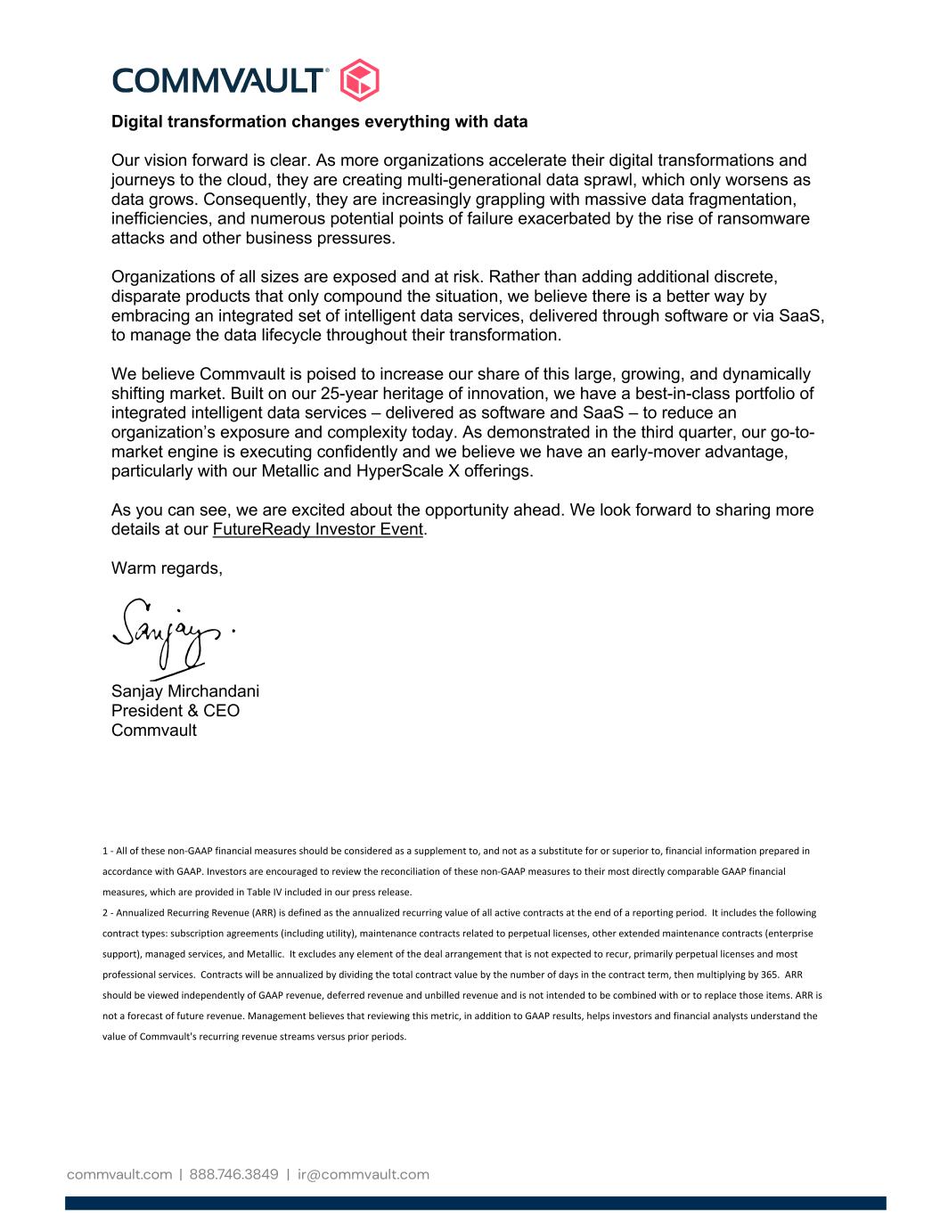 Digital transformation changes everything with data Our vision forward is clear. As more organizations accelerate their digital transformations and journeys to the cloud, they are creating multi-generational data sprawl, which only worsens as data grows. Consequently, they are increasingly grappling with massive data fragmentation, inefficiencies, and numerous potential points of failure exacerbated by the rise of ransomware attacks and other business pressures. Organizations of all sizes are exposed and at risk. Rather than adding additional discrete, disparate products that only compound the situation, we believe there is a better way by embracing an integrated set of intelligent data services, delivered through software or via SaaS, to manage the data lifecycle throughout their transformation. We believe Commvault is poised to increase our share of this large, growing, and dynamically shifting market. Built on our 25-year heritage of innovation, we have a best-in-class portfolio of integrated intelligent data services – delivered as software and SaaS – to reduce an organization’s exposure and complexity today. As demonstrated in the third quarter, our go-to- market engine is executing confidently and we believe we have an early-mover advantage, particularly with our Metallic and HyperScale X offerings. As you can see, we are excited about the opportunity ahead. We look forward to sharing more details at our FutureReady Investor Event. Warm regards, Sanjay Mirchandani President & CEO Commvault 1 - All of these non-GAAP financial measures should be considered as a supplement to, and not as a substitute for or superior to, financial information prepared in accordance with GAAP. Investors are encouraged to review the reconciliation of these non-GAAP measures to their most directly comparable GAAP financial measures, which are provided in Table IV included in our press release. 2 - Annualized Recurring Revenue (ARR) is defined as the annualized recurring value of all active contracts at the end of a reporting period. It includes the following contract types: subscription agreements (including utility), maintenance contracts related to perpetual licenses, other extended maintenance contracts (enterprise support), managed services, and Metallic. It excludes any element of the deal arrangement that is not expected to recur, primarily perpetual licenses and most professional services. Contracts will be annualized by dividing the total contract value by the number of days in the contract term, then multiplying by 365. ARR should be viewed independently of GAAP revenue, deferred revenue and unbilled revenue and is not intended to be combined with or to replace those items. ARR is not a forecast of future revenue. Management believes that reviewing this metric, in addition to GAAP results, helps investors and financial analysts understand the value of Commvault's recurring revenue streams versus prior periods.