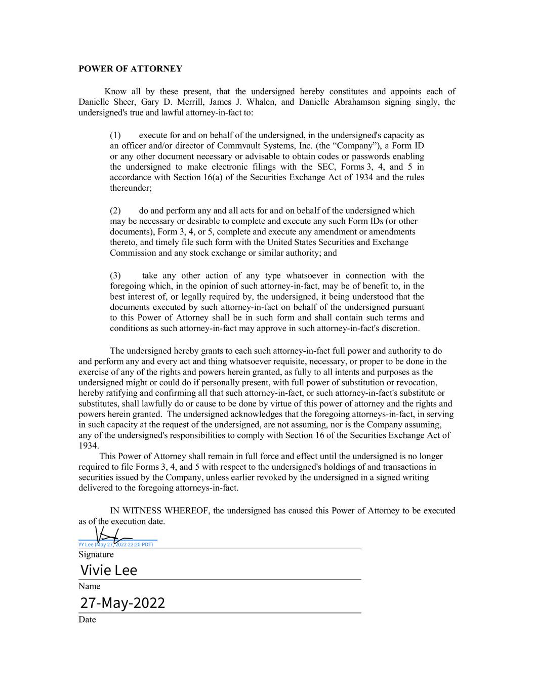 POWER OF ATTORNEY Know all by these present, that the undersigned hereby constitutes and appoints each of Danielle Sheer, Gary D. Merrill, James J. Whalen, and Danielle Abrahamson signing singly, the undersigned's true and lawful attorney-in-fact to: (1) execute for and on behalf of the undersigned, in the undersigned's capacity as an officer and/or director of Commvault Systems, Inc. (the “Company”), a Form ID or any other document necessary or advisable to obtain codes or passwords enabling the undersigned to make electronic filings with the SEC, Forms 3, 4, and 5 in accordance with Section 16(a) of the Securities Exchange Act of 1934 and the rules thereunder; (2) do and perform any and all acts for and on behalf of the undersigned which may be necessary or desirable to complete and execute any such Form IDs (or other documents), Form 3, 4, or 5, complete and execute any amendment or amendments thereto, and timely file such form with the United States Securities and Exchange Commission and any stock exchange or similar authority; and (3) take any other action of any type whatsoever in connection with the foregoing which, in the opinion of such attorney-in-fact, may be of benefit to, in the best interest of, or legally required by, the undersigned, it being understood that the documents executed by such attorney-in-fact on behalf of the undersigned pursuant to this Power of Attorney shall be in such form and shall contain such terms and conditions as such attorney-in-fact may approve in such attorney-in-fact's discretion. The undersigned hereby grants to each such attorney-in-fact full power and authority to do and perform any and every act and thing whatsoever requisite, necessary, or proper to be done in the exercise of any of the rights and powers herein granted, as fully to all intents and purposes as the undersigned might or could do if personally present, with full power of substitution or revocation, hereby ratifying and confirming all that such attorney-in-fact, or such attorney-in-fact's substitute or substitutes, shall lawfully do or cause to be done by virtue of this power of attorney and the rights and powers herein granted. The undersigned acknowledges that the foregoing attorneys-in-fact, in serving in such capacity at the request of the undersigned, are not assuming, nor is the Company assuming, any of the undersigned's responsibilities to comply with Section 16 of the Securities Exchange Act of 1934. This Power of Attorney shall remain in full force and effect until the undersigned is no longer required to file Forms 3, 4, and 5 with respect to the undersigned's holdings of and transactions in securities issued by the Company, unless earlier revoked by the undersigned in a signed writing delivered to the foregoing attorneys-in-fact. IN WITNESS WHEREOF, the undersigned has caused this Power of Attorney to be executed as of the execution date. Signature Name Date YY Lee (May 27, 2022 22:20 PDT) Vivie Lee 27-May-2022